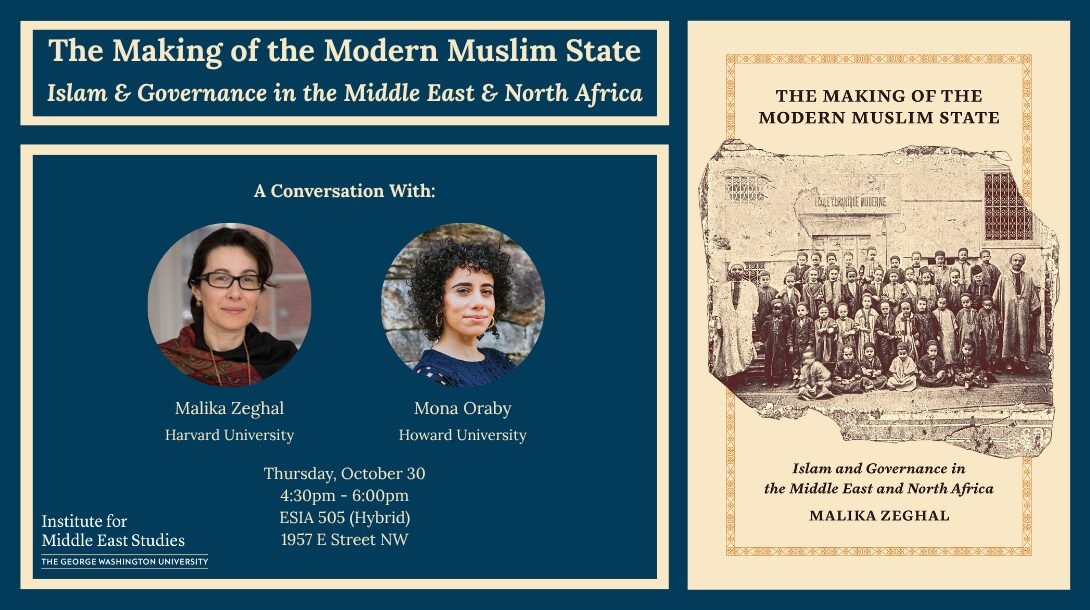 Please join the Institute for Middle East Studies for an in-depth discussion about Malika Zeghal’s work, The Making of the Modern Muslim State. Together with discussant Mona Oraby, Malika Zeghal will share her innovative analysis that traces the continuity of the state’s custodianship of Islam as the preferred religion in the Middle East and North Africa.